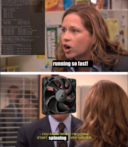 After installing Pop OS, my fans have been running super high, and I had no idea why that changed. My fan curves in my BIOS haven’t changed (I even lowered it to “silent” mode), and my temps are low. After a long time messing around with the fancontrol tool, I somehow made it worse, so I uninstalled fancontrol and am just dealing with it. I think it must have been my Corsair software on windows that was keeping my fans running at reasonable speeds before, and without it, it reverts back to my BIOS controls. Oh well, it’s not that big of a deal, but it did inspire me to make a meme out of it.