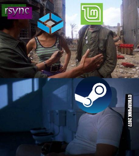 Rsync keeps telling me that my Linux Mint installation is too big to backup on into my TrueNAS machine. And the culprits are my Steam games, especially Cyberpunk 2077 at 66 GB. fml