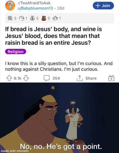 Are you saying it’s a mistranslation and arisen from the dead was actually a raisin from the bread?
