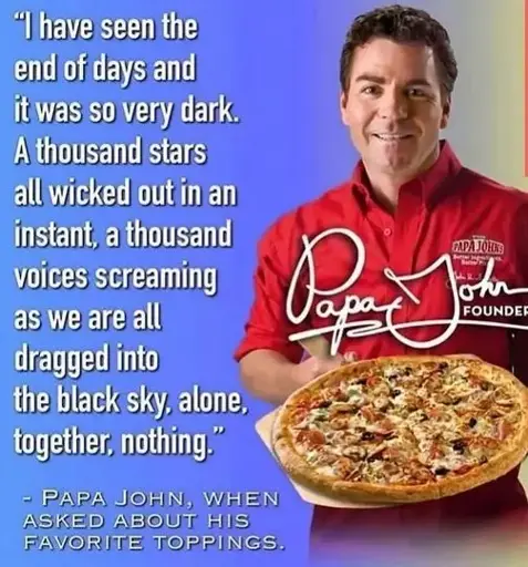 themaninblack@lemmy.world to memes@lemmy.world · 23 days agoPapa Johnlemmy.worldimagemessage-square23fedilinkarrow-up1402arrow-down113
