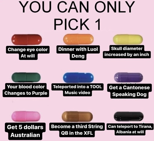 Give me dat blue pill and drop me in Schism. Those weird clay people look like they know how to party!