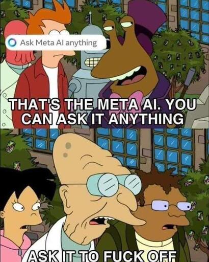 this is literally all I ask the meta AI bubble in my messenger app. It’s fucking annoying and it keeps showing up and all I do is tell it to fuck off