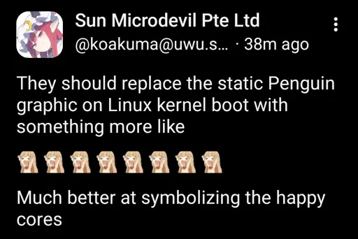 minus-squareBlueSquid0741@lemmy.sdf.orglinkfedilinkarrow-up6·13 days agoMy first impression of this was trying to work out when and why would we see Tux during boot