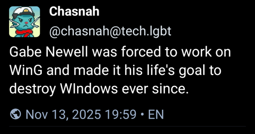 io@piefed.blahaj.zone to linuxmemes@lemmy.worldEnglish · 13 hours agoSteamedplus-squarepiefed.cdn.blahaj.zoneimagemessage-square21fedilinkarrow-up1420arrow-down13